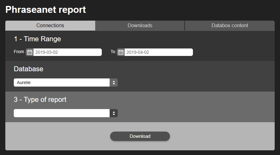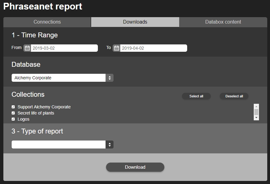 Choose a time range, a database, one or several collections and the type of report: downloads by users, by documents…