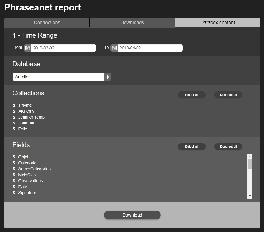 Brand new in this Report interface: the possibility to download the databox content! Choose a time range, a database, one or several collections and the fields. Then click on Download to view the .csv report.