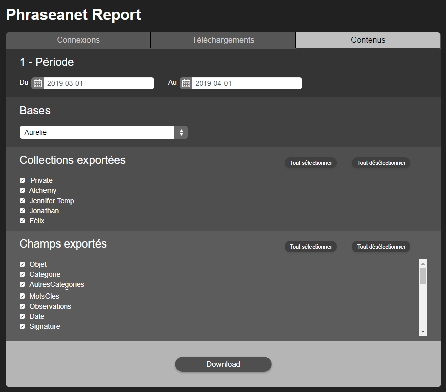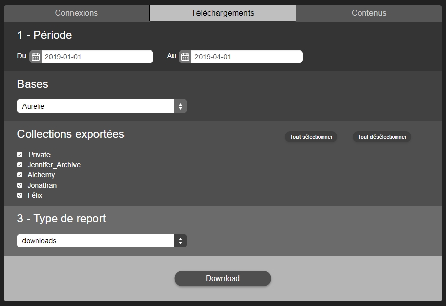 Une nouveauté majeure dans ce Report, la possibilité de télécharger le contenu de la base: Choisissez une période, une base, une ou plusieurs collections, et enfin sélectionnez les champs. Il ne vous reste plus qu’à cliquer sur le bouton Télécharger pour générer le rapport correspondant.